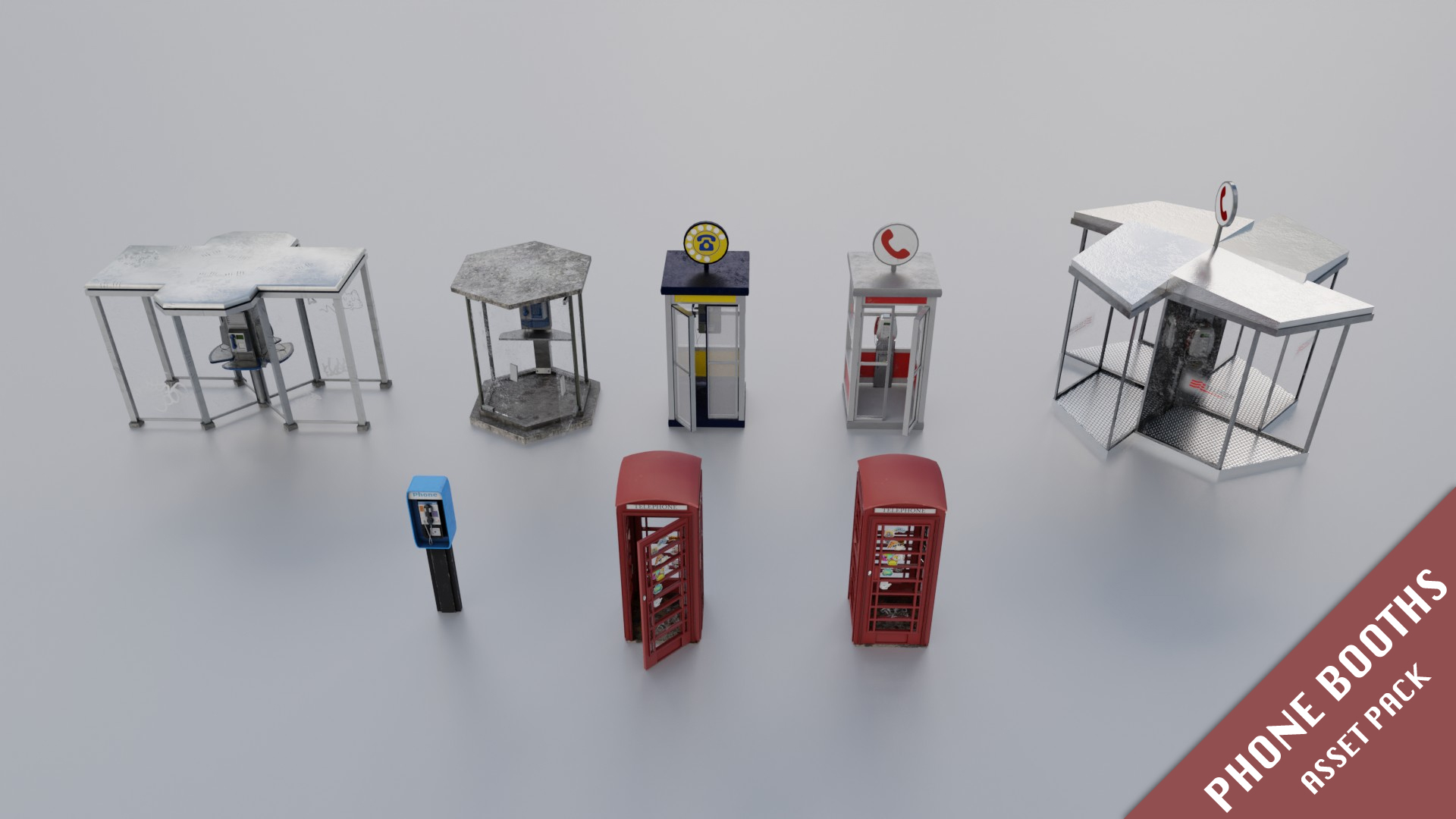 A collection of eight detailed phone cabins to enhance your city scenes.
